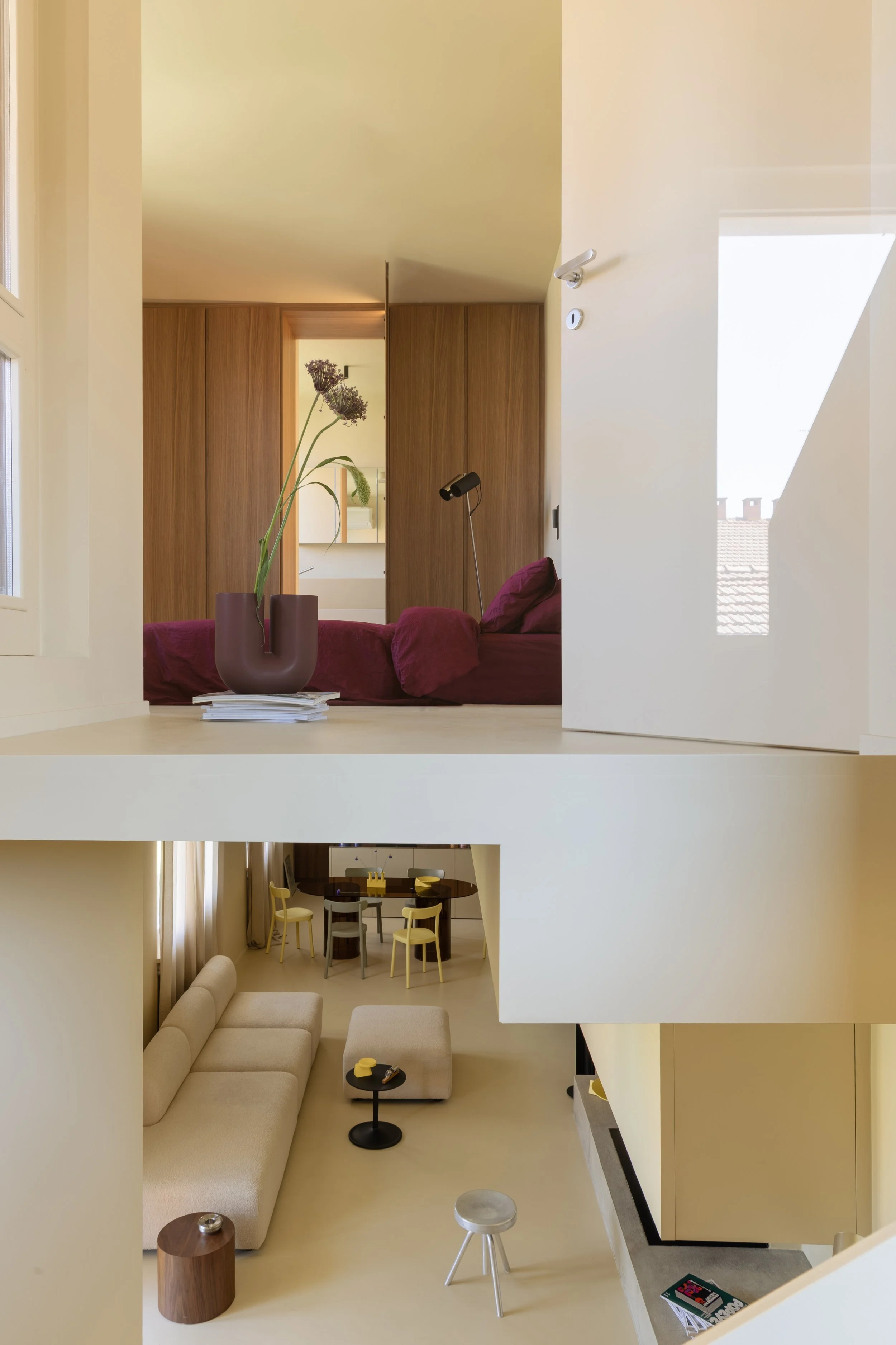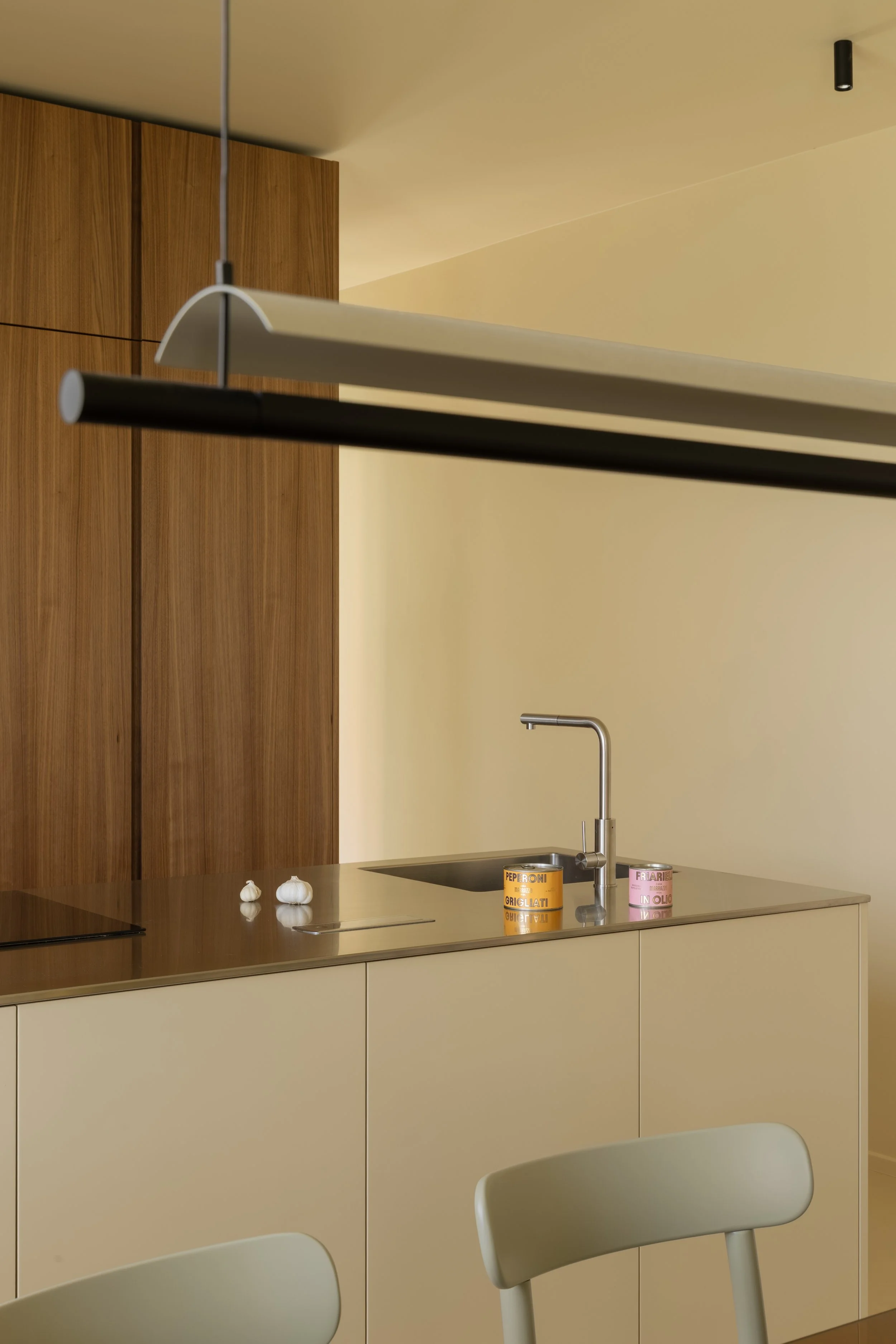 In this residential project, the interior architecture is reduced to the essentials, focusing on the sensory and perceptive experience of living. The space is conceived as a fluid and continuous environment, in which each element interacts harmoniously with the architectural and chromatic context, through a calibrated balance between material, light and colour. The colour palette used, in warm and neutral tones, envelops the rooms in a soft and uniform atmosphere, exalting the materiality of the surfaces and the essentiality of the forms. The heart of the home is the living area, where the kitchen is developed as an integrated system that disappears into an american walnut wall.