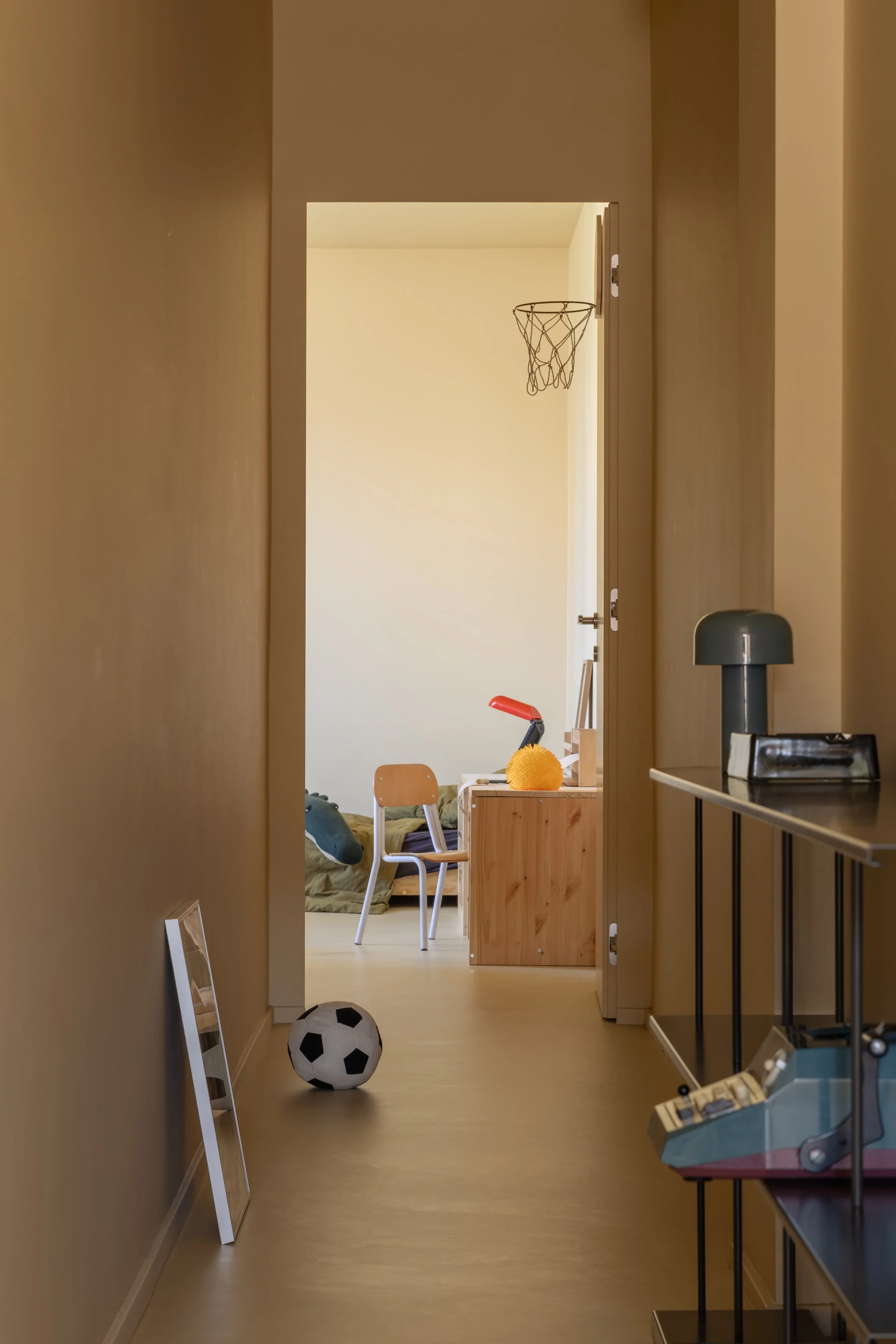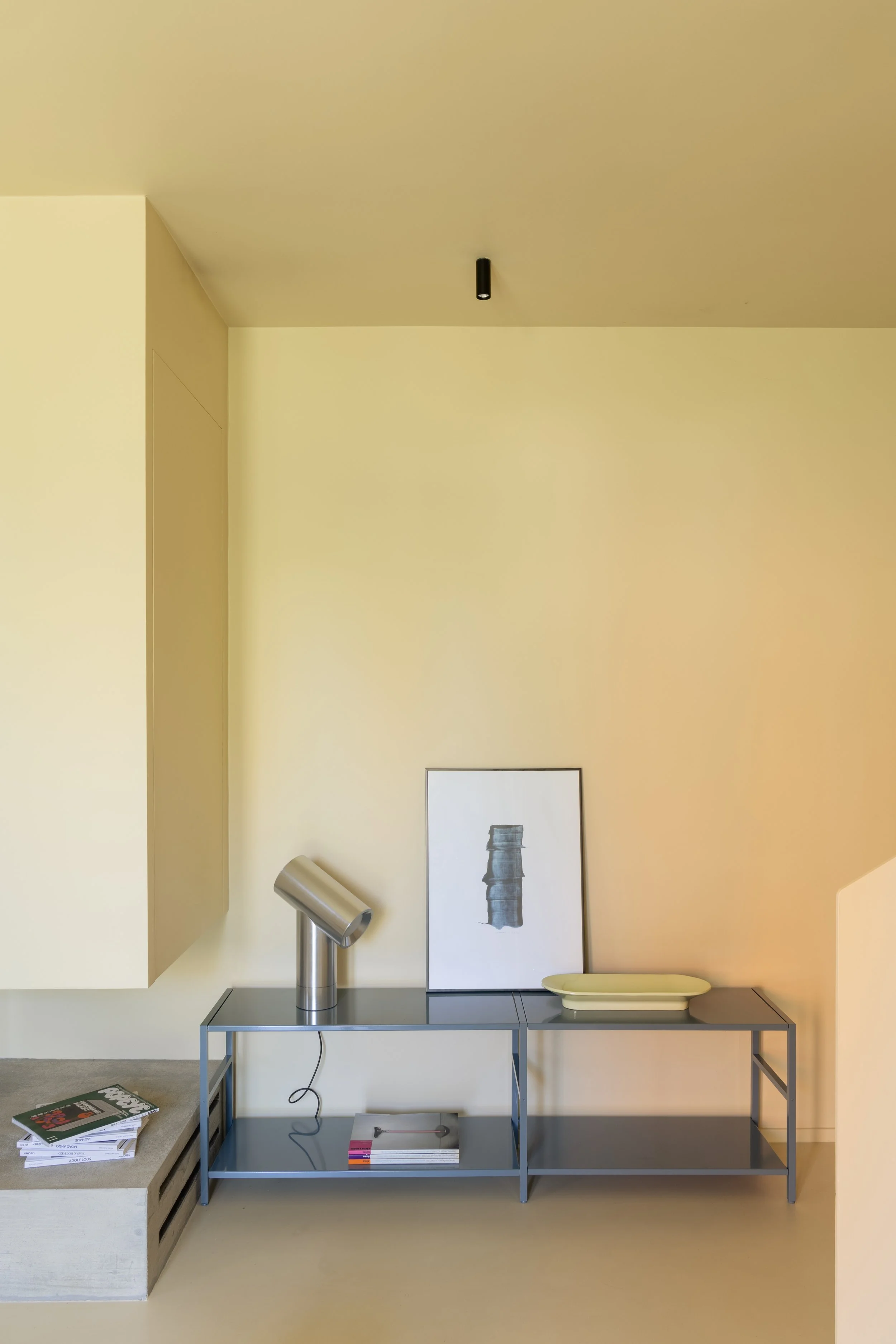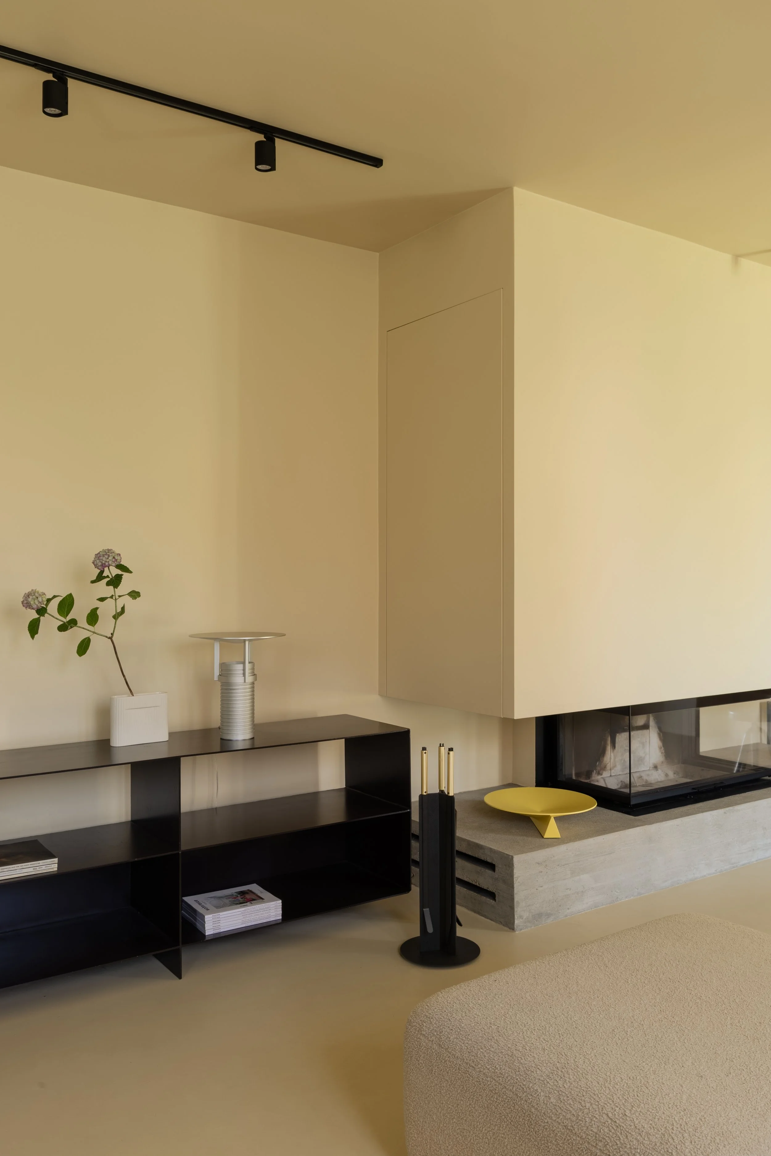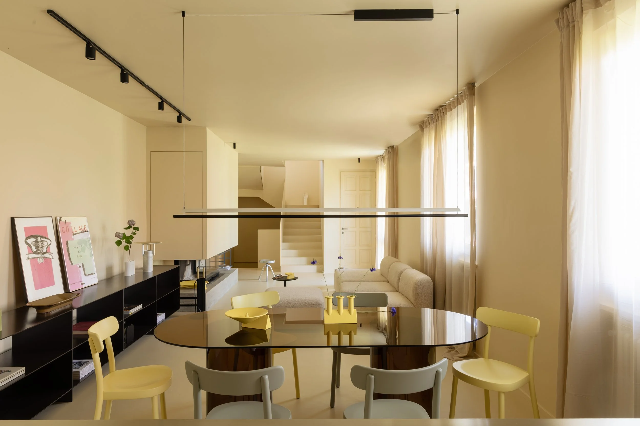 The original fireplace, has been retained and reinterpreted in a contemporary key, becoming an integral part of the new design language. The living area is characterised by the use of low, linear furnishings, designed to contain carefully selected objects and graphic works. Each element is calibrated to avoid visual overload, allowing proportions and the interplay between solids and empty spaces to define the atmosphere of the space. Small contemporary accents — brightly coloured geometric objects and ironic details — break up the composure of the whole with restraint, activating a subtle dialogue between rigour and lightness. The house is on two levels, connected by a sculptural staircase: an architectural element that breaks up the rigour of the ground floor with its multifaceted, theatrical geometry. Natural light, filtering through the existing openings, shapes volumes and depths, drawing soft shadows that chase each other across surfaces, becoming an integral part of the space.