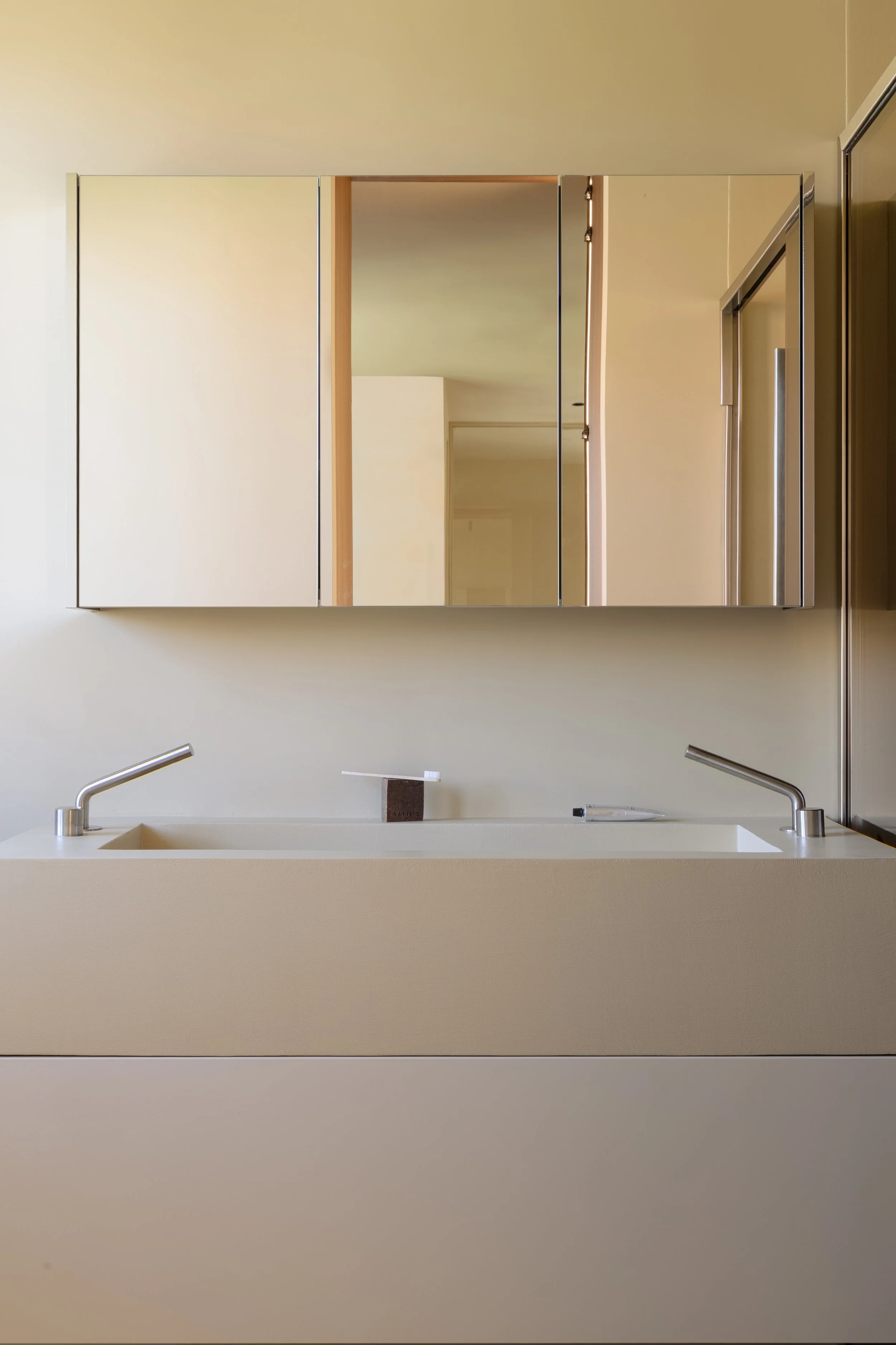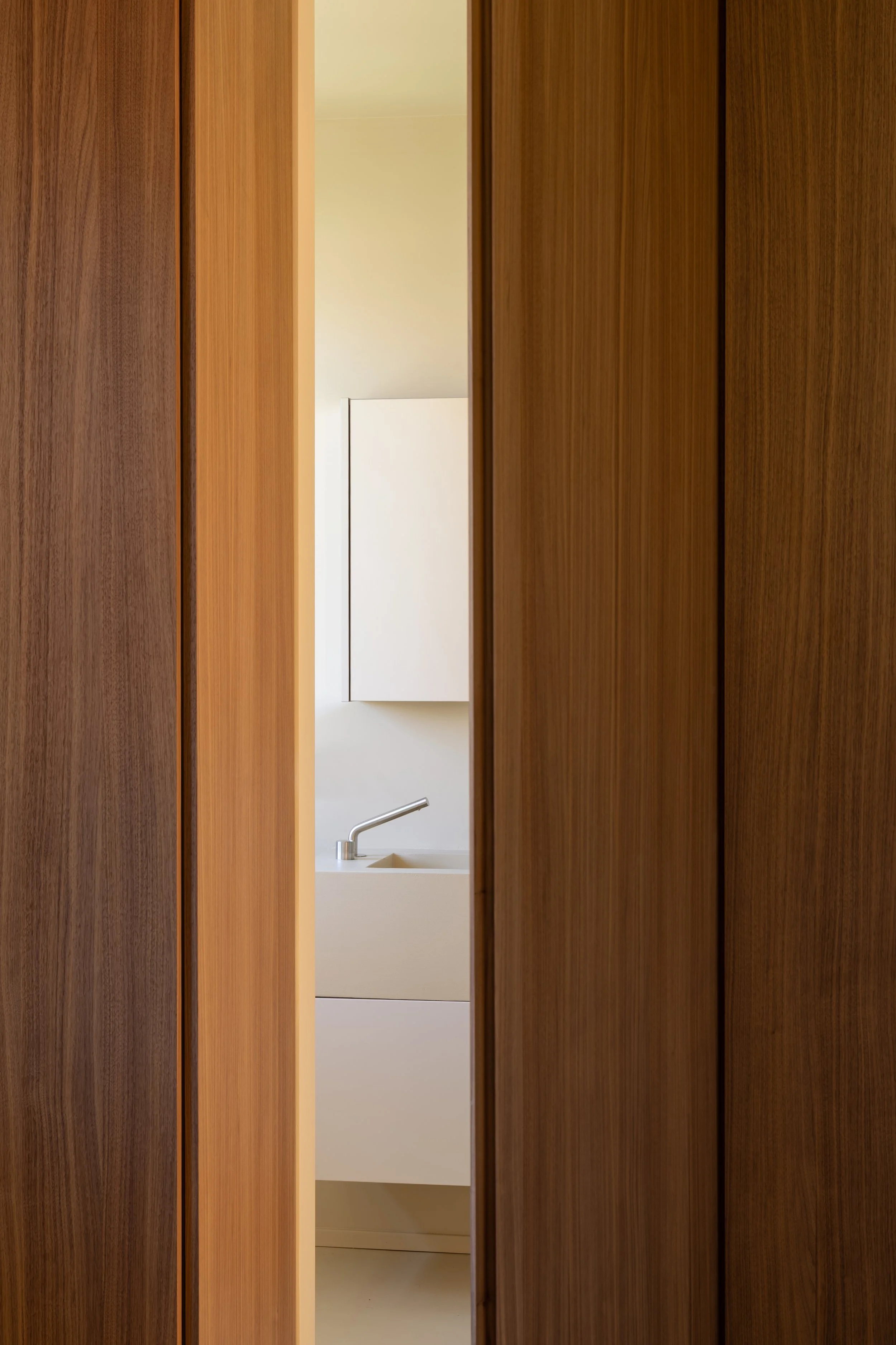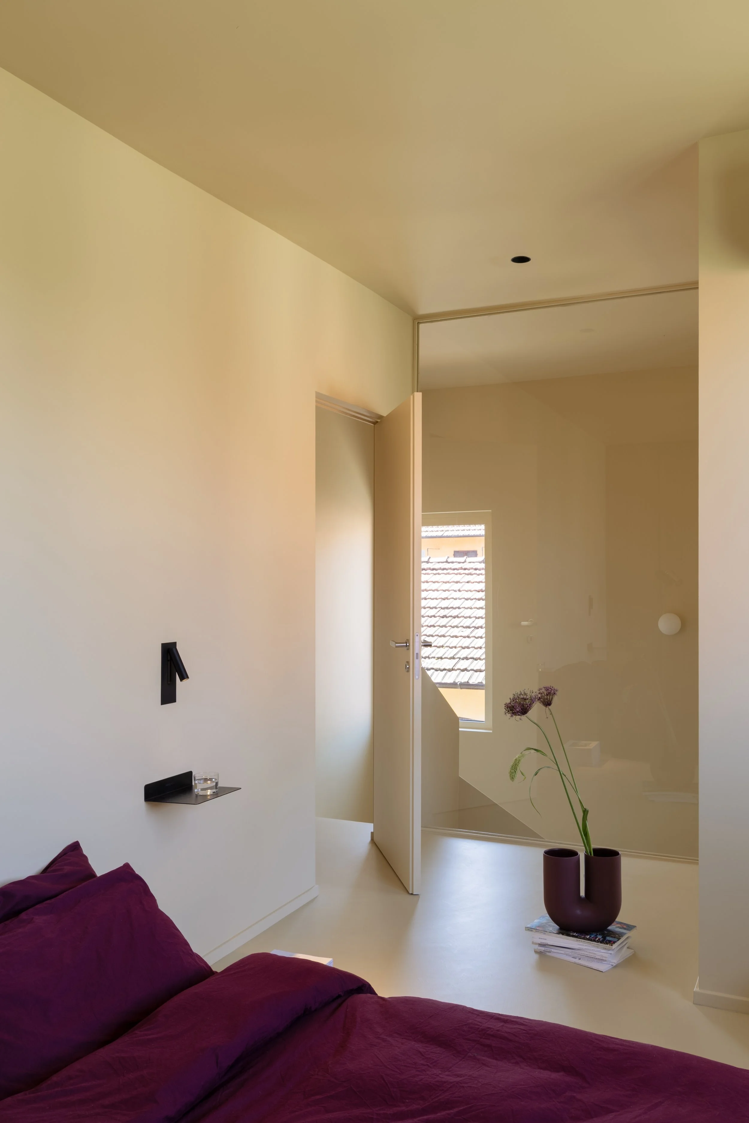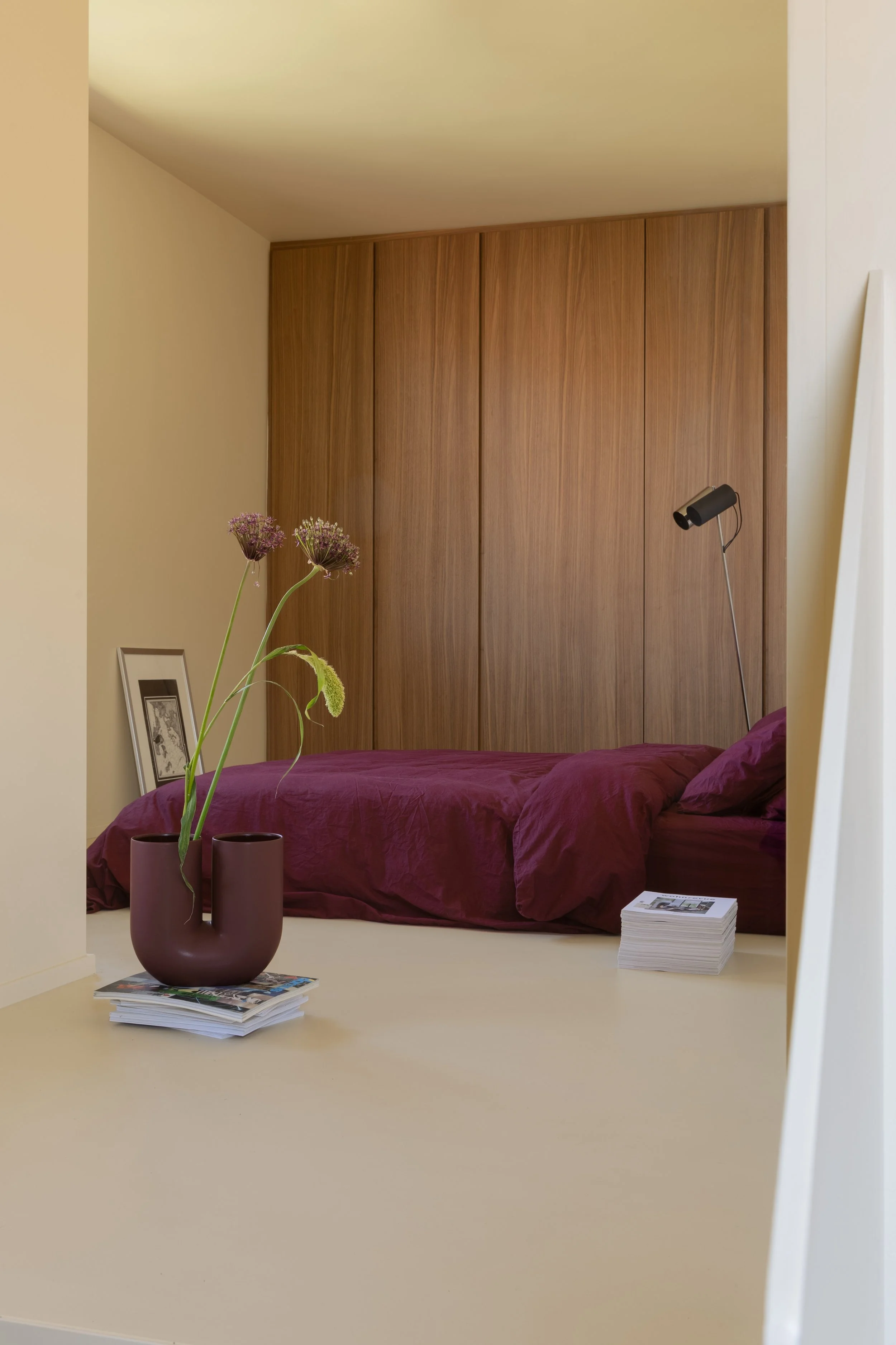 Upstairs, the organisation of the space has focused on creating a simple and well-balanced sleeping area, consisting of a bedroom with an en suite bathroom. In this part of the house, too, the design follows a logic of aesthetic continuity and material consistency, favouring pure volumes and integrated solutions. The bedroom stands out for its intimate and cosy atmosphere: full-height wardrobes in american walnut punctuate the wall, camouflaging the passageway and reinforcing the formal cleanliness of the space. The purple bedding introduces a bold chromatic accent, enlivening the room with a vibrant and unexpected elegance. The bathroom, defined by essential geometries and matt surfaces, features an integrated washbasin and a mirror that reflects natural light, amplifying the perception of space. Bloc_HL is an exercise in balance between form and function, material and light, intimacy and abstraction. A project that explores living as visual and spatial stratification, between architectural rationality and compositional lightness.