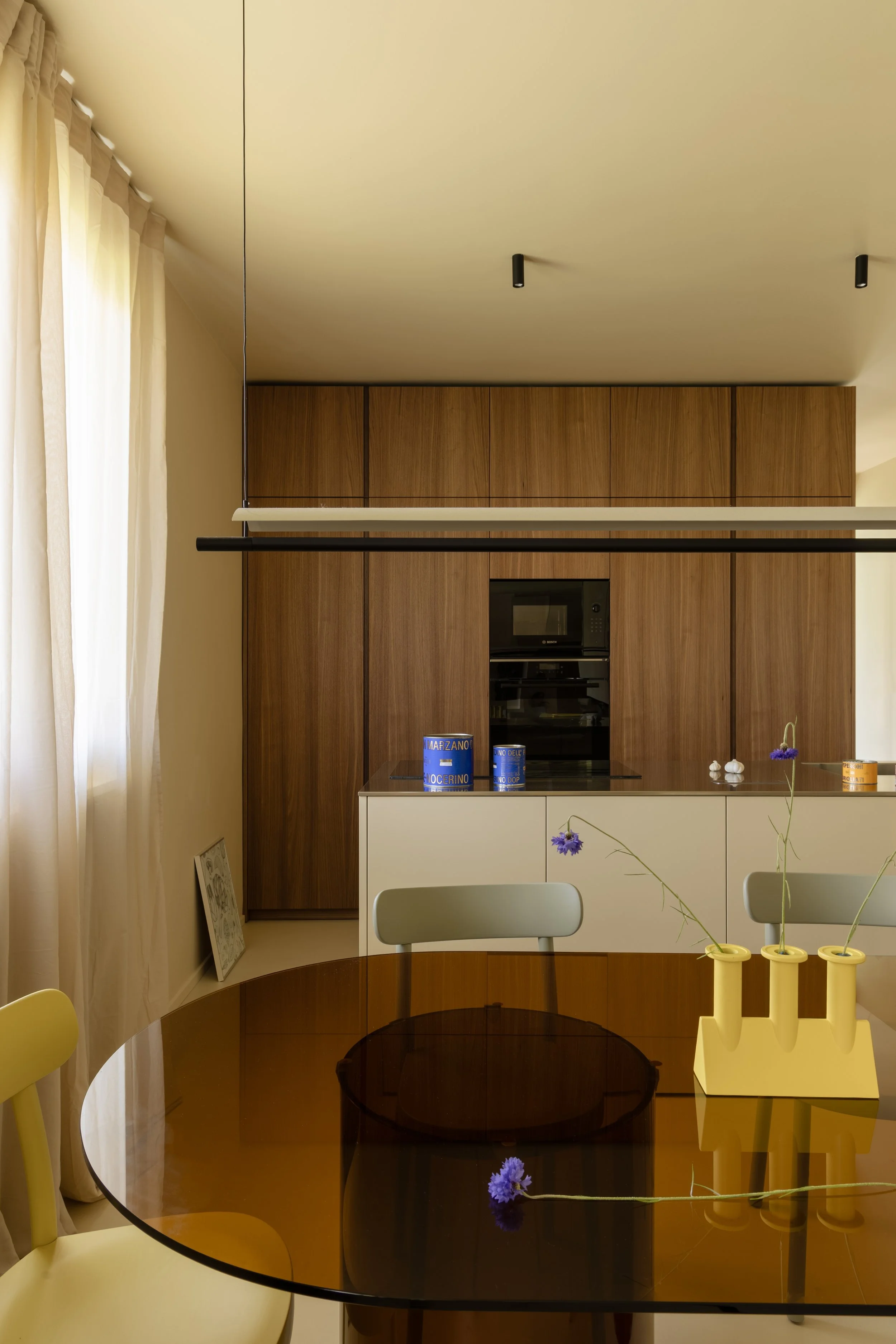 The kitchen island, acts as the visual and functional focal point of the space. A table with a dark glass top and cylindrical bases adds a touch of sophistication, while the pastel-coloured chairs lighten the composition, creating a delicate colour contrast.